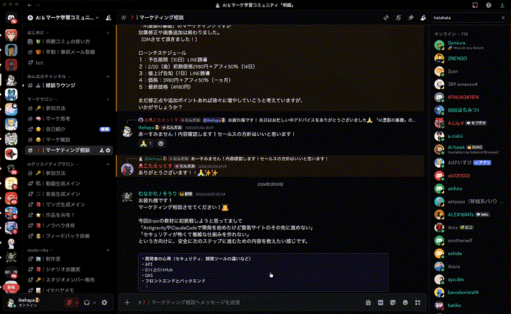 一度購入すれば、Discord上の限定チャンネルに追加料金なしで参加可能。教材だけでは拾いきれない最新のマーケティング情報やAI情報も流れ続けます。