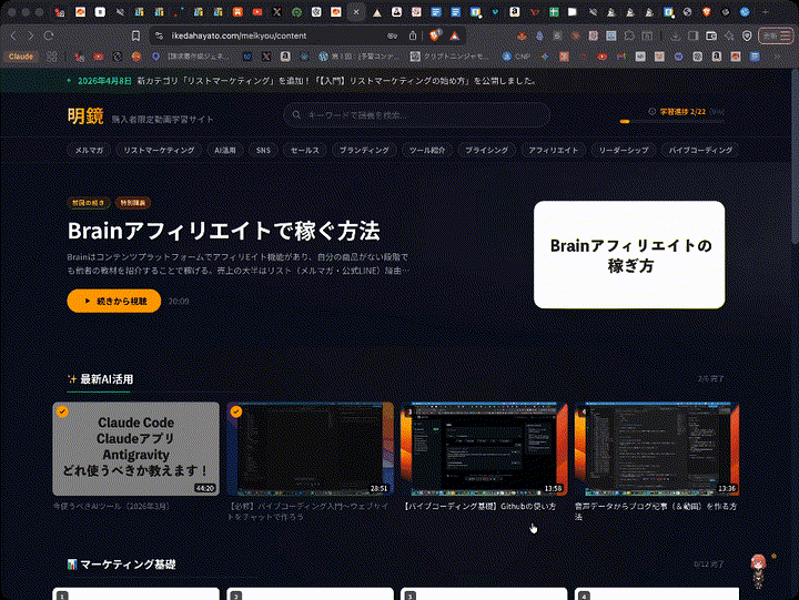 購入者限定のeラーニングサイトで、マーケティングノウハウのみならず、Claude Code・Antigravity・各種動画生成AIなどの実践ノウハウを随時追加していきます。